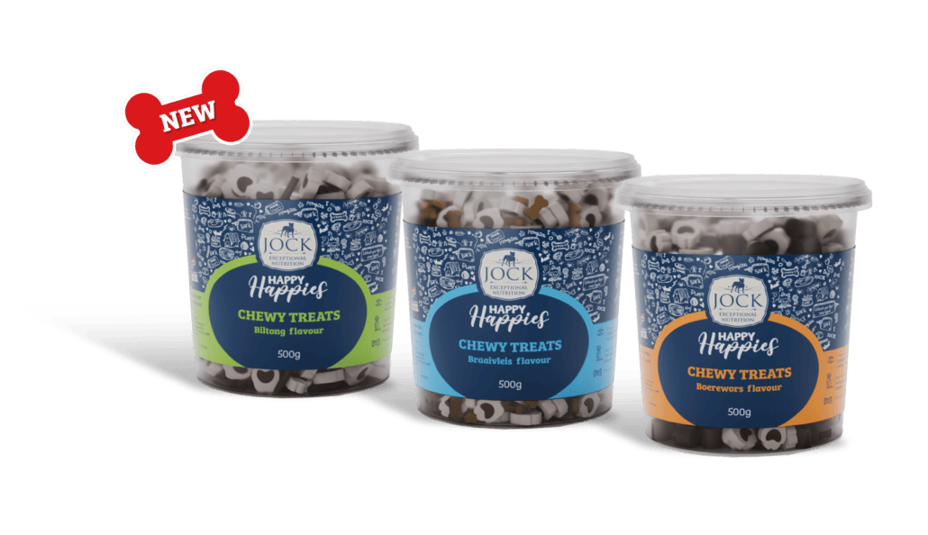 JOCK Happy Happies dog biscuits are the perfect complement to our scientifically formulated dog food range. These delicious and nutritious treats are ideal for rewarding, teaching and reinforcing good behaviour. Our big and small happies are the perfect size for both small and large dogs, making them a suitable treat for all dog breeds. Available in three truly South African flavours – Boerewors, Braaivleis and Biltong.